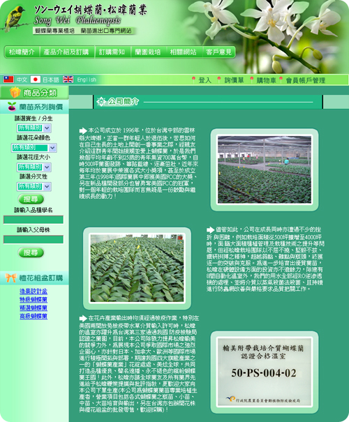 本公司成立於 1996年,位於台灣中部的雲林縣大埤鄉,正當一群年輕人於退伍後,苦思如何在自己生長的土地上開創一番事業之際,經親友介紹這群青年開始接觸並愛上蝴蝶蘭,於是我們幾個平均年齡不到25歲的青年集資700萬台幣,自時500坪蘭園發跡、篳路藍縷、逐漸茁壯,近年來每年均於蘭展中榮獲各式大小獎項,甚至於成立第三年(1998年)國際蘭展中即獲美國FCC的大獎、另在新品種開發部分也曾勇奪美國FCC的冠軍,對一個年輕的栽培團隊而言無疑是一份鼓勵與繼續成長的動力!